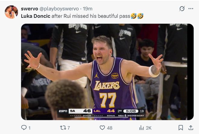 里夫斯、詹姆斯繼續傷停,盧卡-東契奇復出帶隊,上一場湖人平民陣容擊敗了開拓者,東契奇此役復出帶隊面對狀態不俗的馬刺。首節東契奇就展現了超級魔術師的風采,首節拿到13分5籃板3助攻3搶斷2蓋帽,東契奇積極性太強。